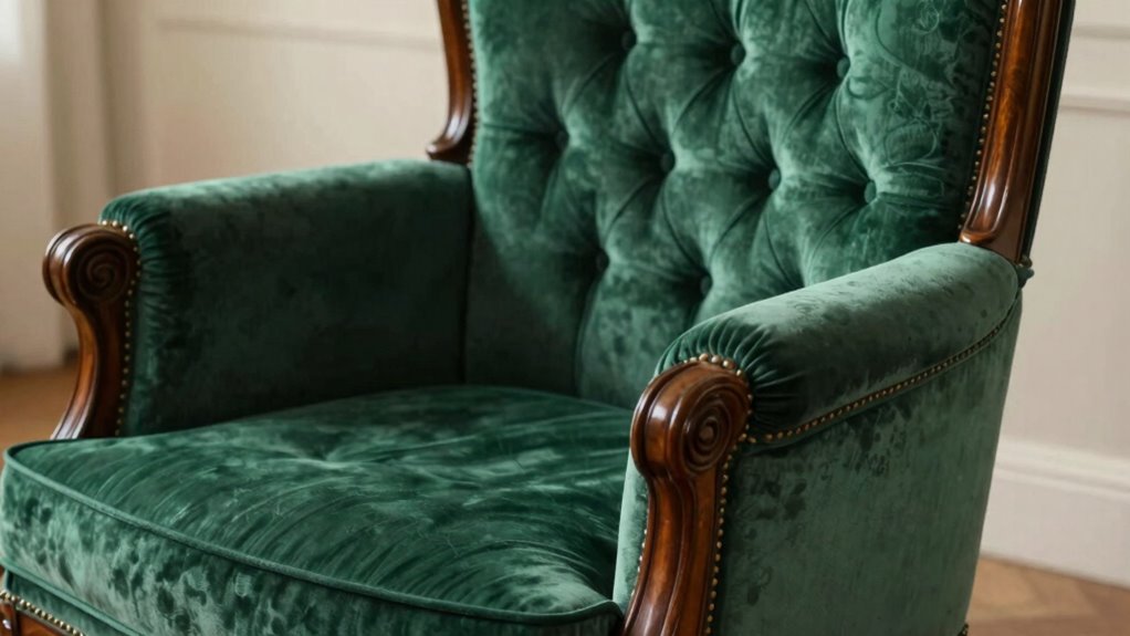 To keep your wingback chair pristine, practice proper upholstery cleaning and maintenance tips. Regularly vacuum to remove dust and debris, preventing buildup. For spills, blot gently with a clean cloth—avoid rubbing. Use a mild, upholstery-safe cleaner for stains, testing first in an inconspicuous spot. Keep fabric fresh and fabric fibers flexible by avoiding direct sunlight and using gentle brushings. Consistent care keeps your chair comfortable, clean, and alluring.